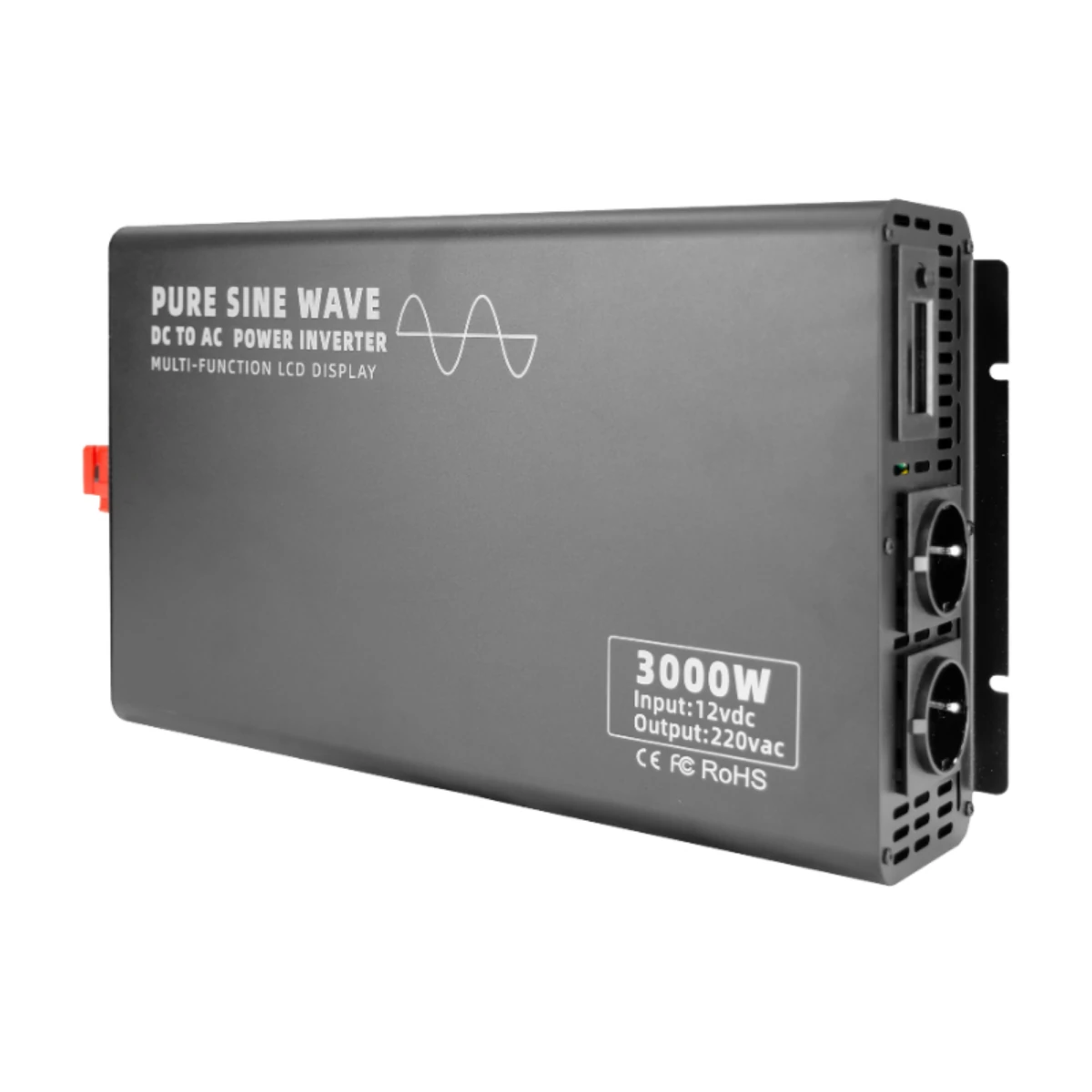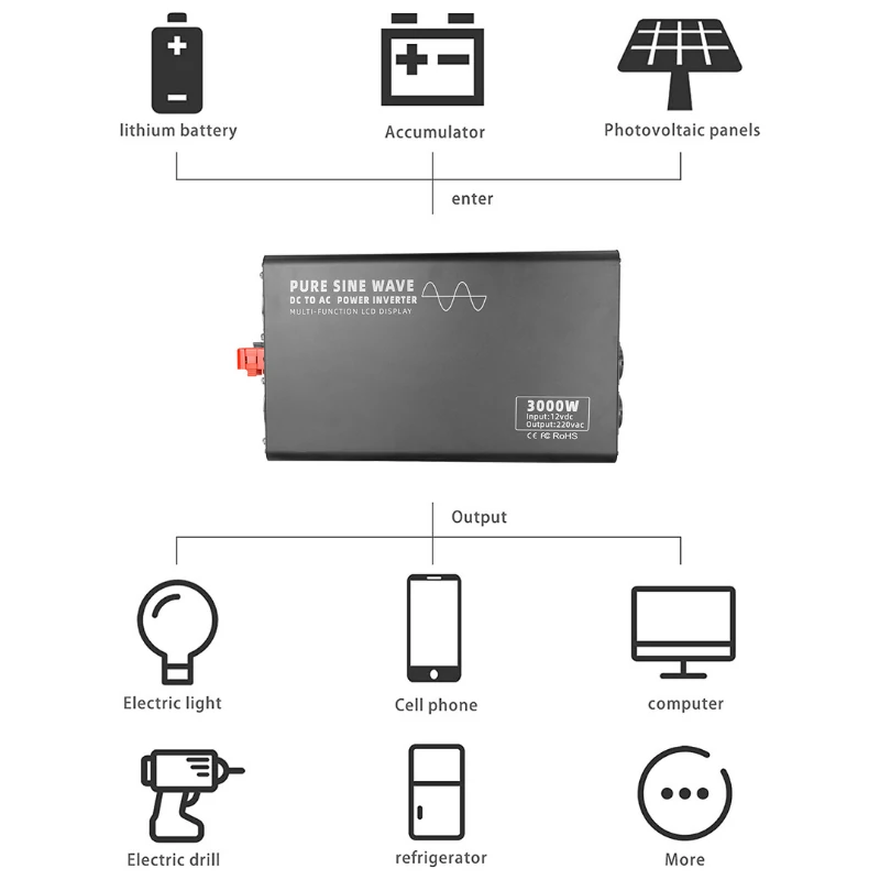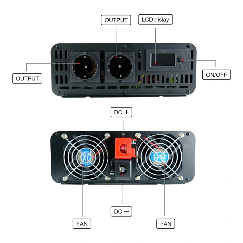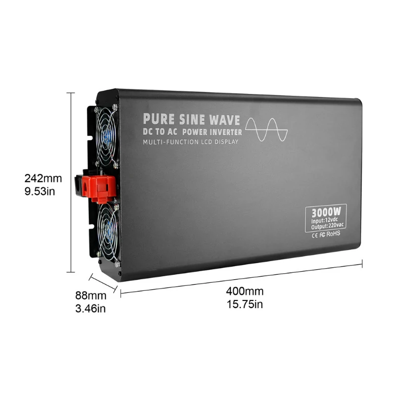 2000 watt pure sine wave inverter 12V DC to 110V/220V AC, with remote control, USB port, LCD display, output voltage 120V, 230V, 240V are available, 50Hz or 60Hz frequency, 12 volt pure sine wave inverter suitable for TV, refrigerator, induction cooker and electric fan.