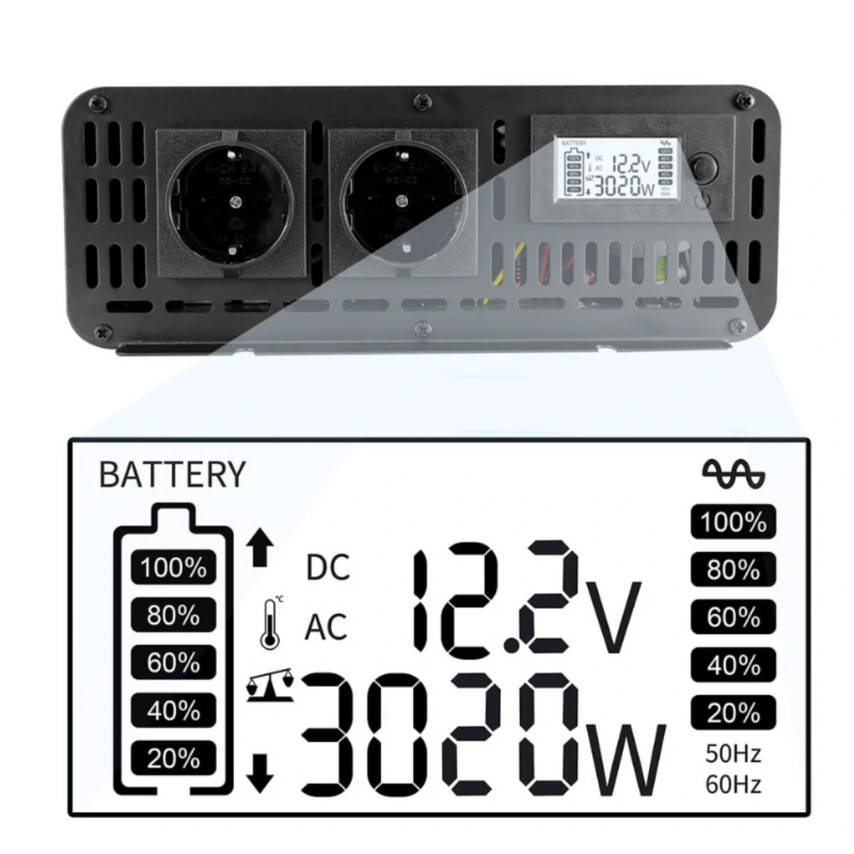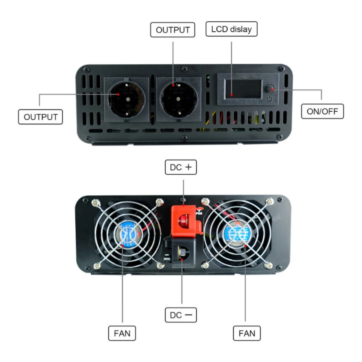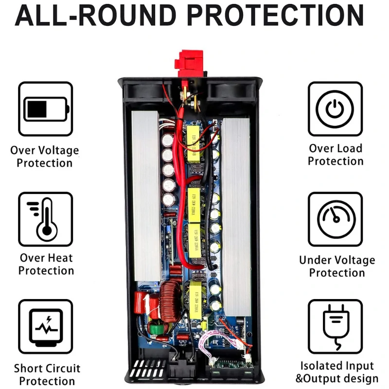 When the inverter high voltage, low voltage, over temperature, overload protection function is turned on, once the protection of the inverter is triggered, the inverter disconnects the power supply and the load enters the protection mode for the first time, and issues an alarm through the buzzer alarm device. Make your use more secure.